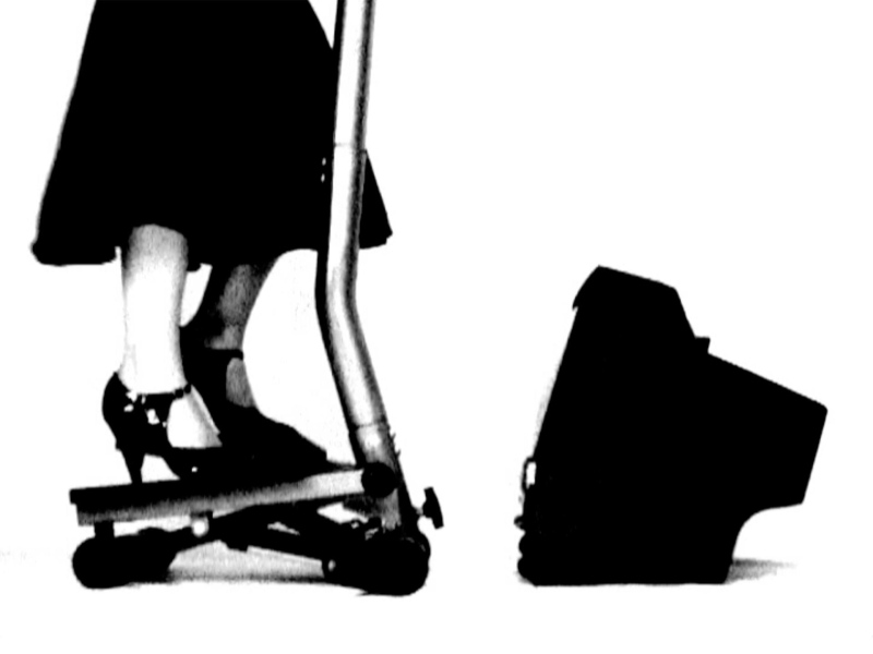 CORPS SAINT-ESPRIT SAIN présente une confrontation de deux masses noires, l'une en mouvement et l'autre immobile. Sur le step, le corps produit des mouvements constants et répétitifs. L'action crée un tempo corporel qu'elle restitue à l'espace. L'ensemble des trois éléments - le corps, la machine et le poste de télévision - apparaît comme interdépendant. Mais cette cadence corporelle rend ambigu le moteur de l'action. De cet ensemble-appareil, lequel donne la mesure ? Est-ce le corps qui actionne le step, ou l'objet lui-même? Ce double-sens se reporte sur la relation entre le téléviseur et ce corps-machine. Face à cette exécution absurde et machinale, le spectateur est alors renvoyé à sa propre image. Doit-il s'identifier à ce corps en mouvement ? Ou au téléviseur, tel un voyeur ?