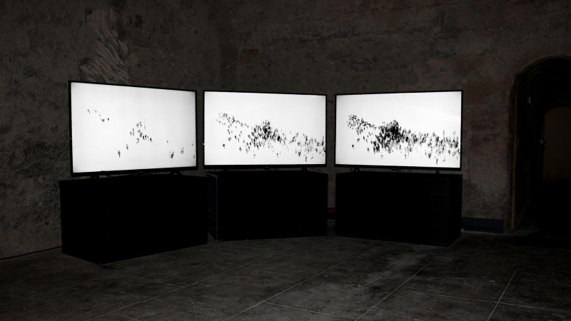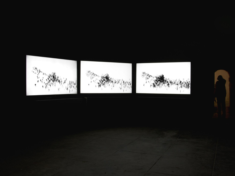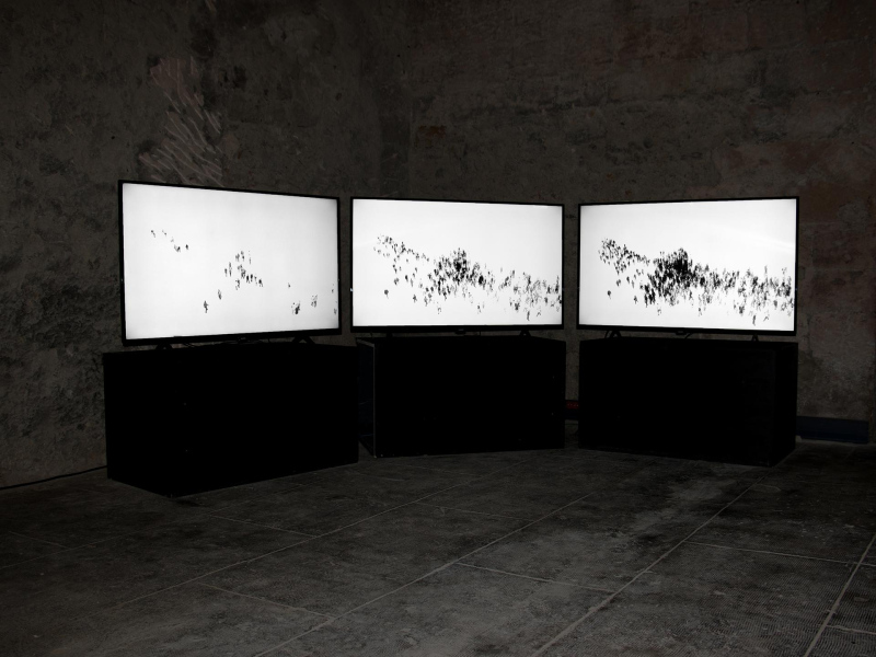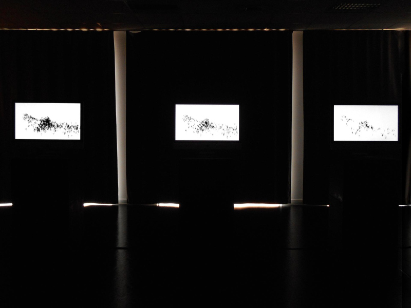 3 vidéos numériques HD, noir&blanc, muettes, 0.15.17. Lecture synchronisée en boucle sur 3 écrans plasma noirs 55''. Edition 1 + 1EA.