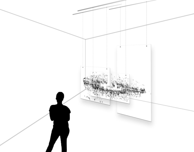 3 photographies numériques, noir&blanc, 110x120cm, 120x80cm, 60x120cm. Tirage direct sous plexiglas transparent 3 mm. Suspension inox et rails. Edition 1 + 1EA.
