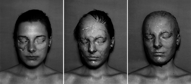 I gradually cover my face and then my head with clay. Meeting of matters. My successive gestures contribute to a corporeal homogenization. Erasure of distinctive signs / Revelation in three stages of a new homogeneous surface.