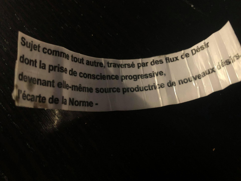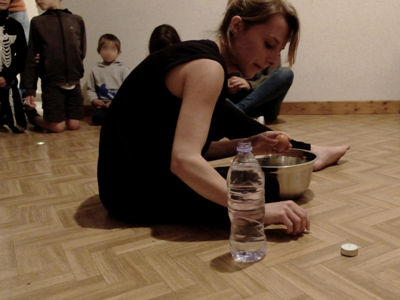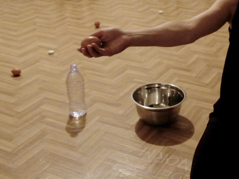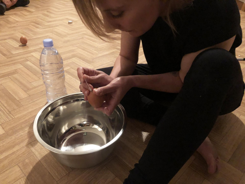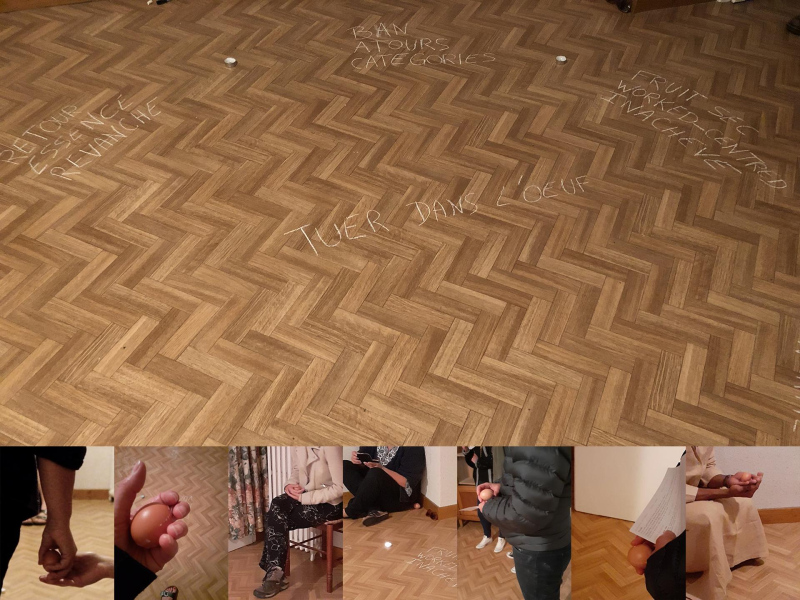 « Seven eggs are placed on the floor and form a circle which defines the space of my performance. With a safety pin, I pierce an egg on two opposite sides. Then I blow inside in order to empty it of all its organic matter, keeping only its shell. I insert a part of my text into the egg, rolling the paper and slipping it inside. I close the two holes of the egg with candle wax. I write three keywords from the text on the floor. I give the egg to someone in the audience. I repeat these movements for each of the seven eggs. The whole text is thus dispersed in the audience, in seven people who have the choice to break the egg to know immediately its content or to take it away and to keep it ».