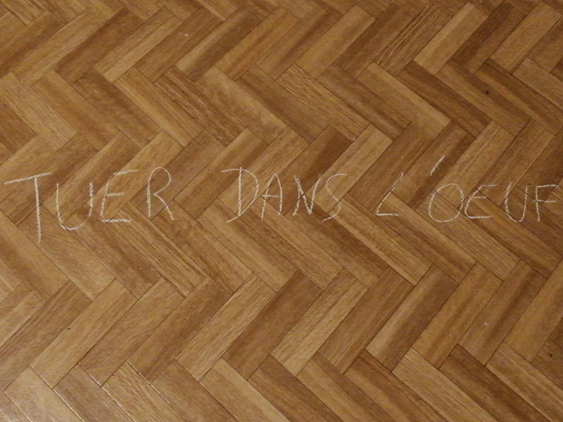 The performance TDO questions the feminine identity from the point of view of its association to Fertility and Maternity. It considers the forms of transmission, over time, of social norms linking the Woman and the Mother, which are perpetuated by/in the patriarchal societies on one hand and, on the other, reintroduced by essentialist movements based on a return to Nature. The French expression « Tuer dans l'oeuf » is taken literally and is executed in several stages to oppose limited and regressive conceptions of feminine identity, in a play of reversal between Nature and Culture and by the relay of my act. This work is based on the writings of the French philosopher and feminist Elisabeth Badinter, from which the text of the performance was created, in seven parts.