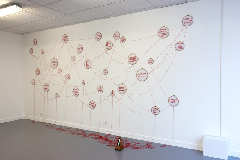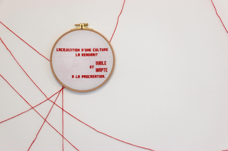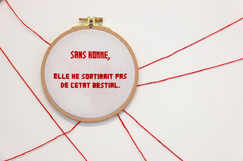 TRANSMISSION-S is an installation that investigates our cultural heritage as for the mode of thought of women, their bodies, their place and their function within society, through speeches and writings from different times and fields, from Sciences and Medicine to Philosophy, from Religion to Media, from Literature to Politics, etc. This installation questions the transmission of this cultural heritage over time and societies, from a processual point of view, when certain elements seem to progressively lose visibility to become latent. It examines the effects of deliberate choices of upholding or concealment of these in the collective consciousness and memory. TRANSMISSION-S results from the meeting with the French writer and feminist Benoîte Groult's works, which reveal the high level of rejection of women and the female body in our history and culture, by ignorance, contempt, hate, condescension, habit and comfort, and which show how all the fields of society center on this rejection, in order to make it solid and permanent. The Benoîte Groult's approach is situated in the transmission of this past as completely as possible, in order to make us realize the mechanisms of the rejection of women and to initiate their deconstruction. TRANSMISSION-S originates from a reversal, that of the recurrent assignment of women to needlework. It proposes a new state of play to extend that of Benoîte Groult, almost fifty years apart.