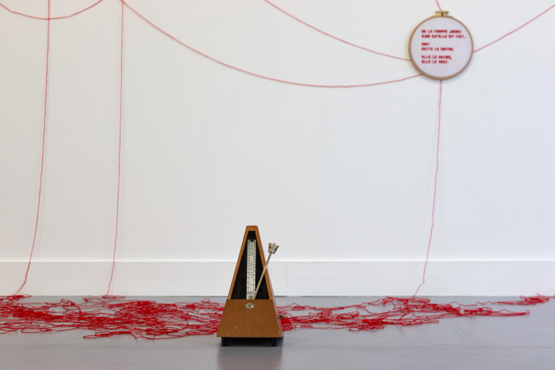 33 embroidery frames (various sizes) + 666 red thread + 1 broken wooden metronome + stereo sound. Edition 1.